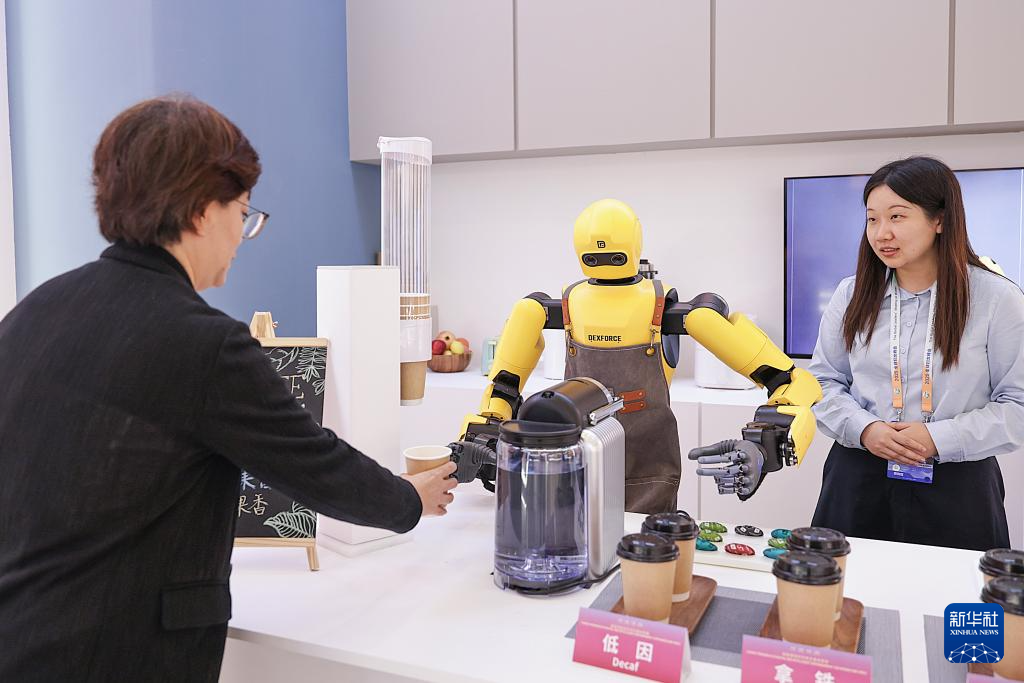 10月14日,参观者在展览上体验机器人制作咖啡。