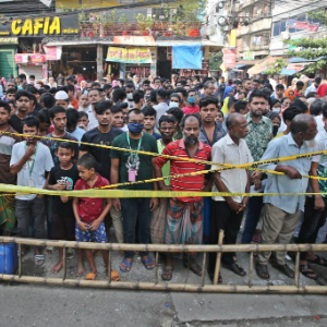 10月15日,在孟加拉国首都达卡,人们在制衣厂和化学品仓库火灾现场附近围观。