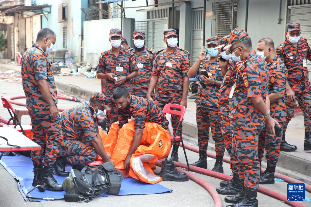 10月15日,在孟加拉国首都达卡,消防人员在制衣厂和化学品仓库火灾现场附近工作。