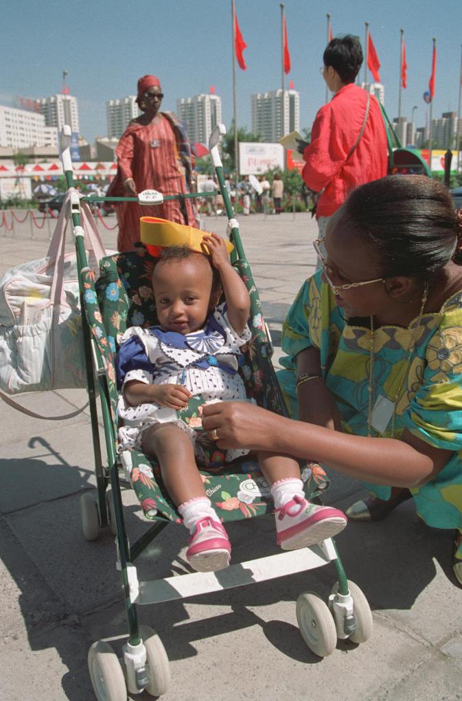 1995年9月9日,一位世妇会与会者带着孩子在北京街头散步。