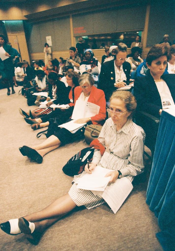 1995年,世妇会会议期间,有代表坐在地上开会。