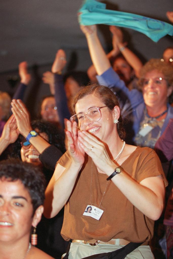 1995年9月13日,在国际会议中心主会场举行的讨论会上,与会人士为有关妇女经济平等问题的发言热烈鼓掌。