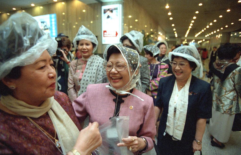 1995年9月6日,北京秋雨蒙蒙。在北京国际会议中心,几位参加联合国第四次世妇会的泰国代表用塑料袋套在头上当雨具。