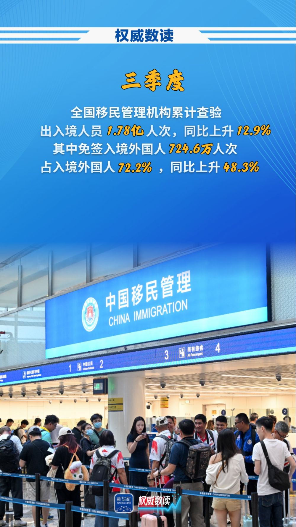 16日国家移民管理局新闻发布会的消息显示,今年三季度,全国移民管理机构累计查验出入境人员1.78亿人次,同比上升12.9%,其中免签入境外国人724.6万人次,同比上升48.3%。一起来看。