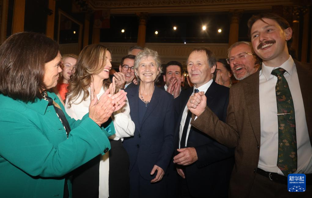 10月25日,在爱尔兰首都都柏林,凯瑟琳·康诺利(前左三)获胜后接受祝贺。新华社发(埃蒙·法雷尔摄)