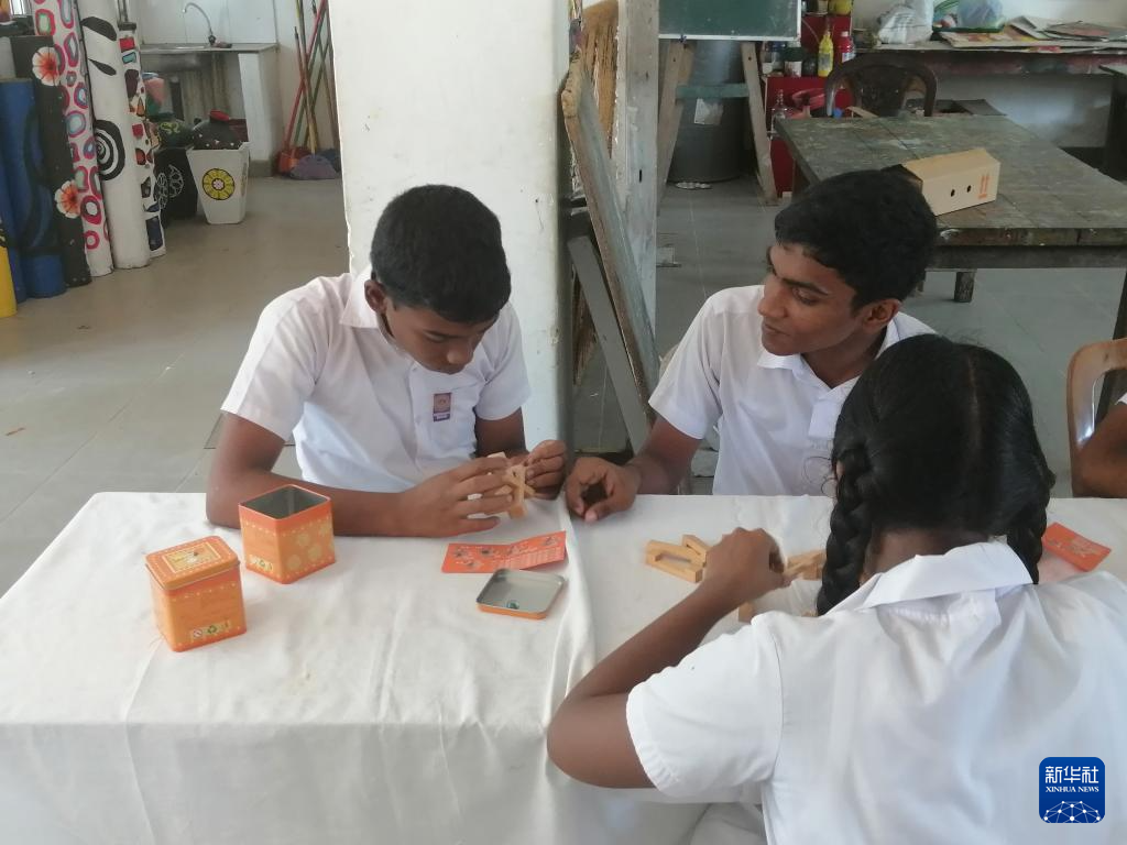 10月30日,在斯里兰卡霍勒讷举行的“我和中国”文化交流活动上,斯里帕利学院学生体验鲁班锁。新华社记者 吴子钰 摄