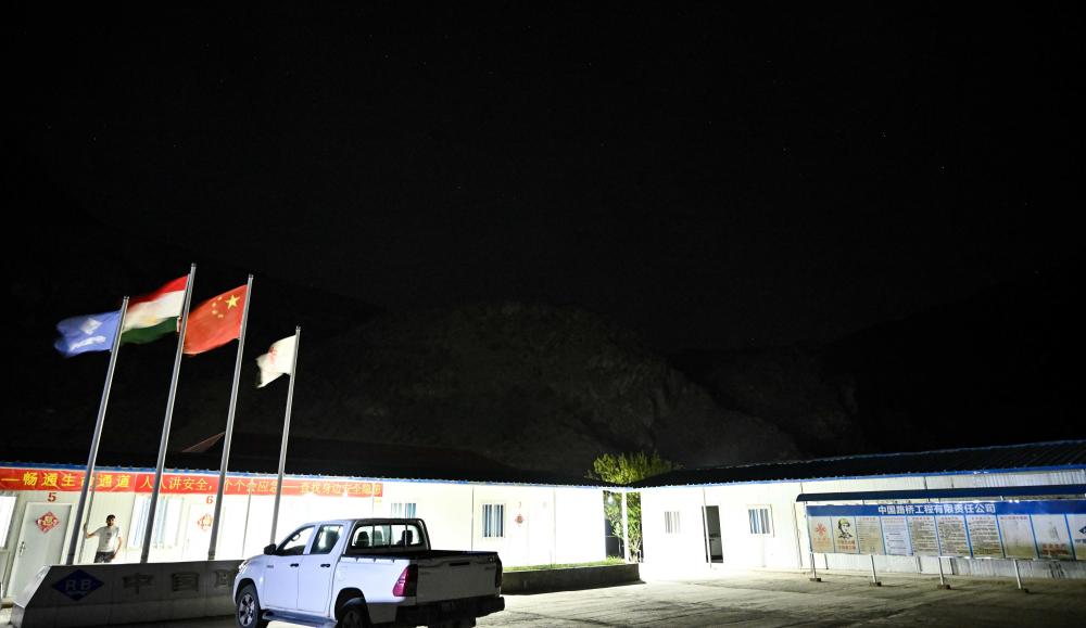 这是在塔吉克斯坦卡拉依洪姆村附近拍摄的中塔公路二期工程施工现场。