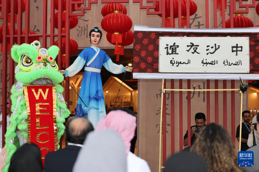 11月13日,在沙特首都利雅得,嘉宾在第三届沙特阿拉伯国际手工艺周中国馆欣赏木偶。新华社记者 王海洲 摄