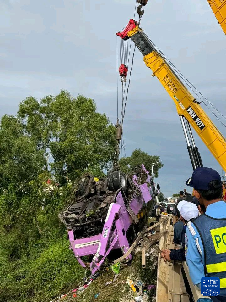 11月20日,工程车辆在柬埔寨磅同省吊起失事客车。新华社发(柬埔寨磅同省警察局供图)