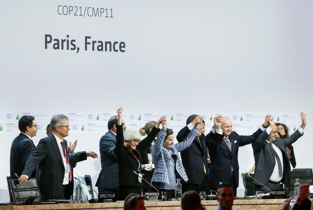 2015年12月12日晚,《联合国气候变化框架公约》近200个缔约方在法国巴黎一致同意通过《巴黎协定》,为2020年后全球应对气候变化行动作出安排。新华社记者周磊摄