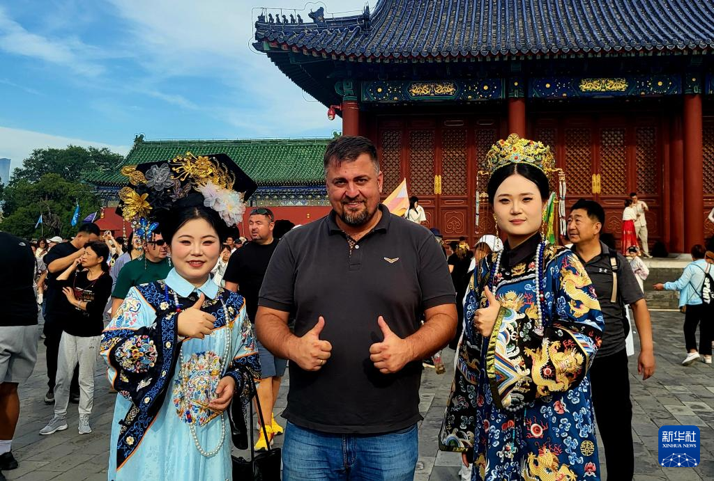 图为塞尔维亚制片人博什科·科扎尔斯基在北京天坛与身着中国古代服饰的中国游客合影。新华社发(受访者供图)