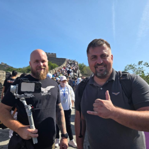 图为塞尔维亚制片人博什科·科扎尔斯基(右)在长城与《文化旅行家在中国》摄制团队成员合影。新华社发(受访者供图)