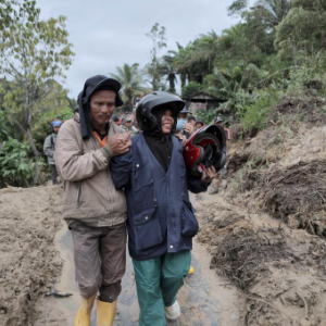 11月28日,在印度尼西亚西苏门答腊省,救援人员在受灾地点工作。