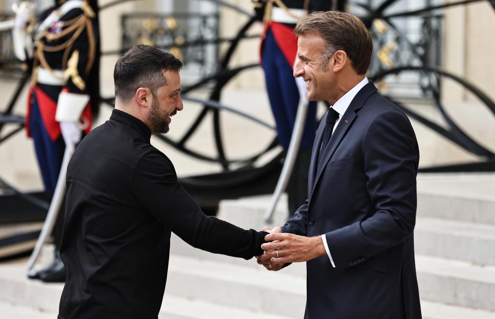 2025年9月4日,在法国首都巴黎的总统府爱丽舍宫,法国总统马克龙(右)迎接出席“志愿联盟”线上会议的乌克兰总统泽连斯基。新华社记者高静摄