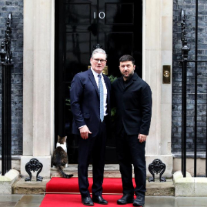 12月8日,在英国伦敦唐宁街10号首相府前,英国首相斯塔默(左)与乌克兰总统泽连斯基合影。
