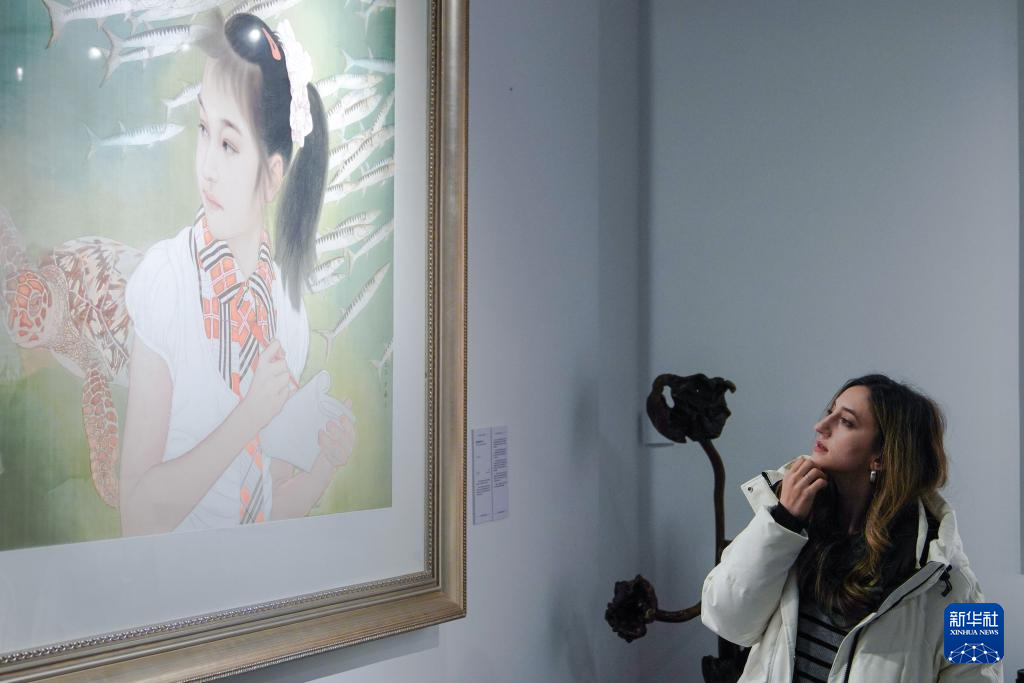 12月17日,外国媒体记者在长春市春京西历史文化街区参观吉林省首届书画名家作品展。
