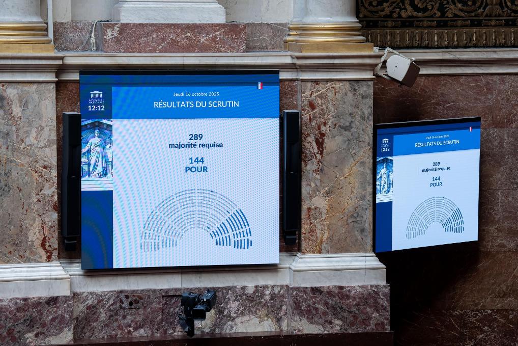 这是10月16日在位于法国巴黎的国民议会拍摄的第二项不信任动议投票结果。法国国民议会16日对两项针对政府的不信任动议进行了投票,动议最终都未获通过,政府未被议会推翻。新华社发(奥雷利安·莫里萨尔摄)