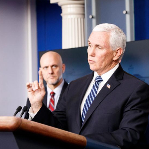 图为2020年3月6日,在美国华盛顿白宫,时任美国副总统彭斯(前)在新闻发布会上讲话。新华社发(沈霆摄)