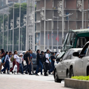 12月2日,在委内瑞拉首都加拉加斯,行人在早高峰时段穿过玻利瓦尔大街。新华社记者李木子摄
