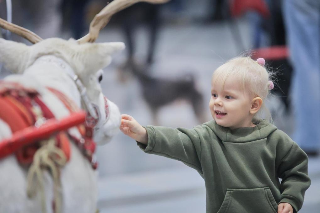 12月14日,在俄罗斯圣彼得堡,一名女孩在“2025宠物秀”上喂鹿。新华社发(莫京娜摄)