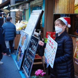 12月18日,在日本东京筑地站附近,餐厅店员在路旁招揽生意。新华社记者贾浩成摄