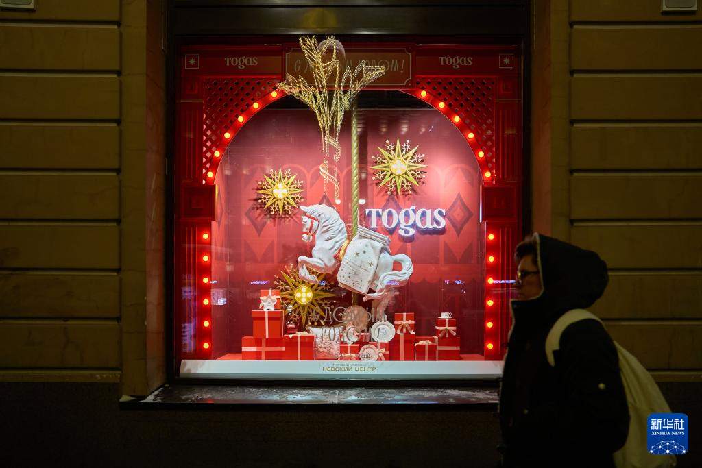 2025年12月31日,行人走过俄罗斯圣彼得堡街头用骏马装饰的橱窗。