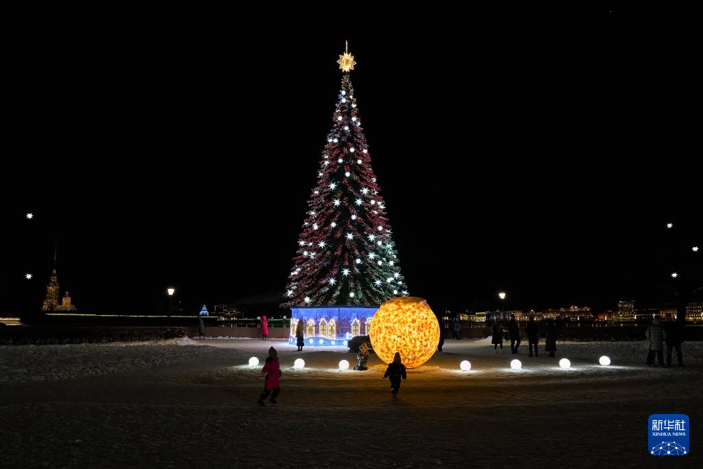 2025年12月31日,俄罗斯圣彼得堡的街心花园点亮节日灯光。