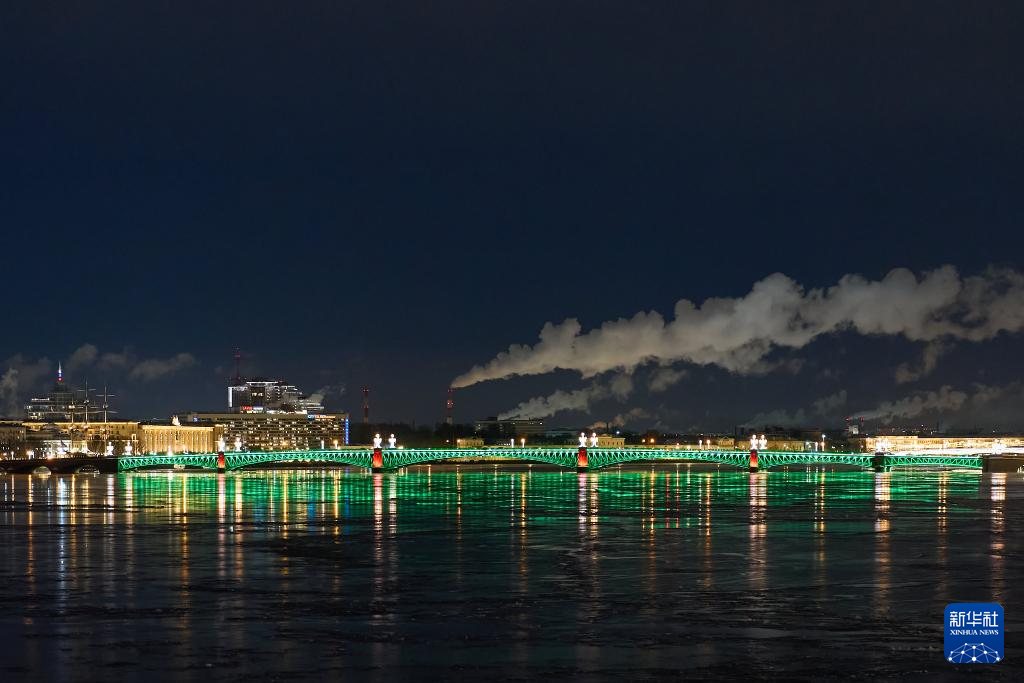 2025年12月31日,俄罗斯圣彼得堡的三一桥亮起了节日灯光。