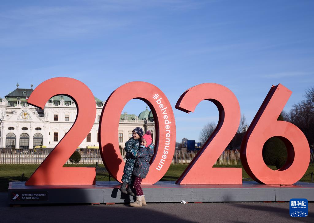 2026年1月1日,在奥地利首都维也纳的美景宫,小朋友在“2026”标识前拍照留念。