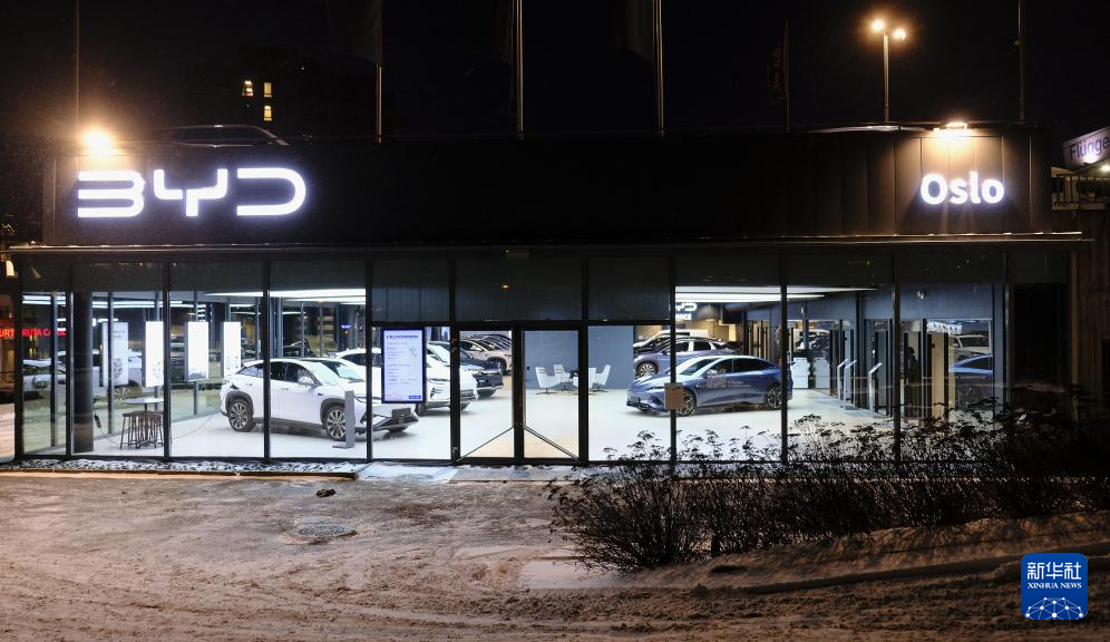 这是1月2日在挪威首都奥斯陆拍摄的中国车企比亚迪的一家经销商门店。新华社发(陈雅琴摄)