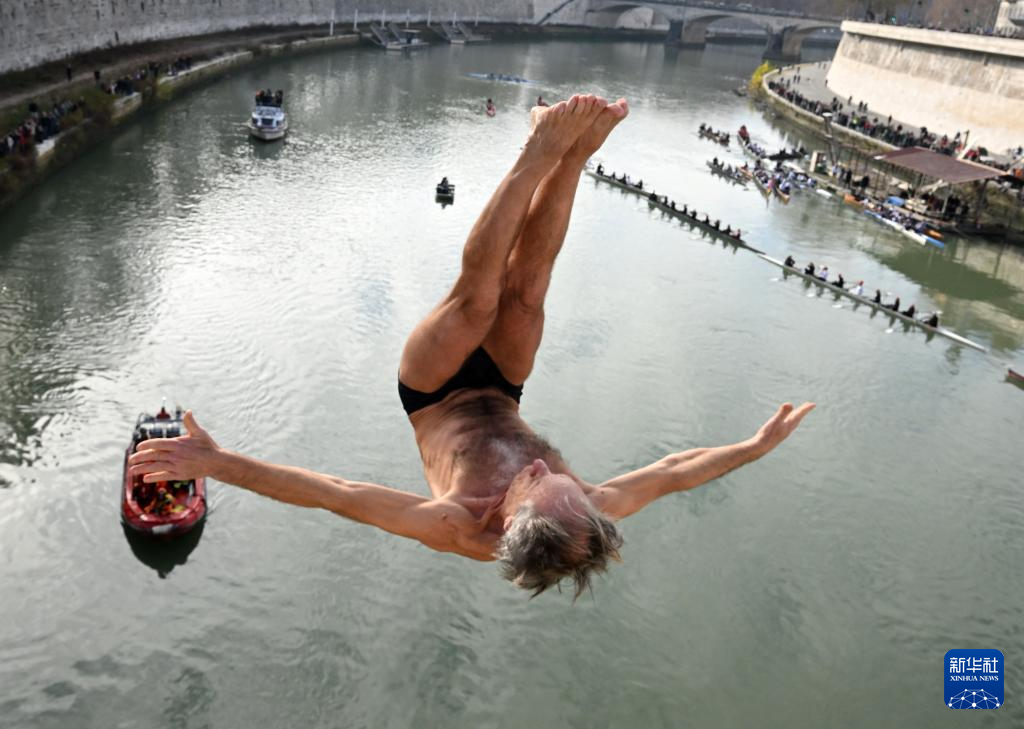 2026年1月1日,在意大利首都罗马,一名男子在台伯河上跳水庆祝新年。