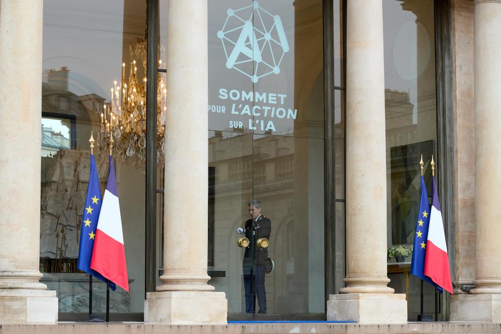 2025年2月10日,在法国巴黎爱丽舍宫,工作人员在等待迎接参与人工智能行动峰会的嘉宾。新华社记者高静摄