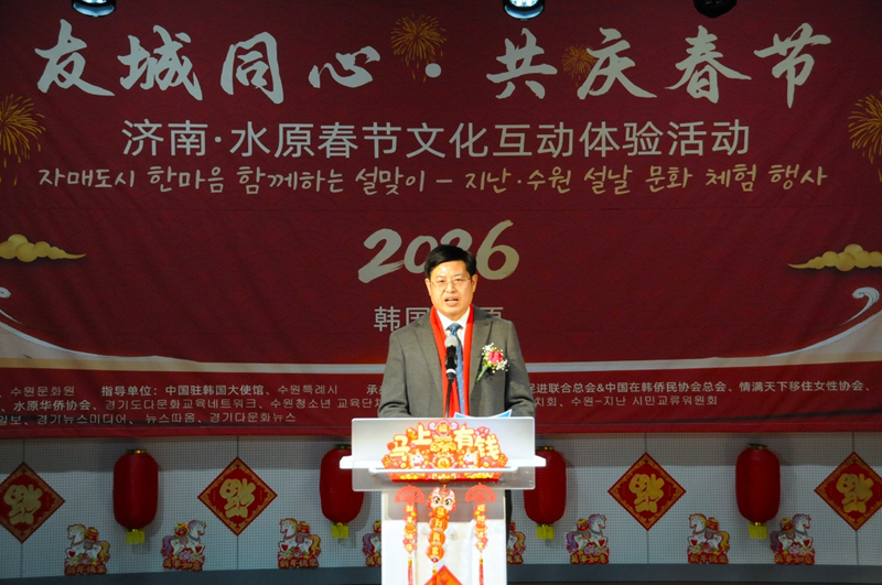 中国驻韩国大使馆公参兼总领事钟洪糯在“友城同心·共庆春节”济南·水原春节文化互动体验活动上致辞。记者黄昕欣 摄