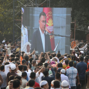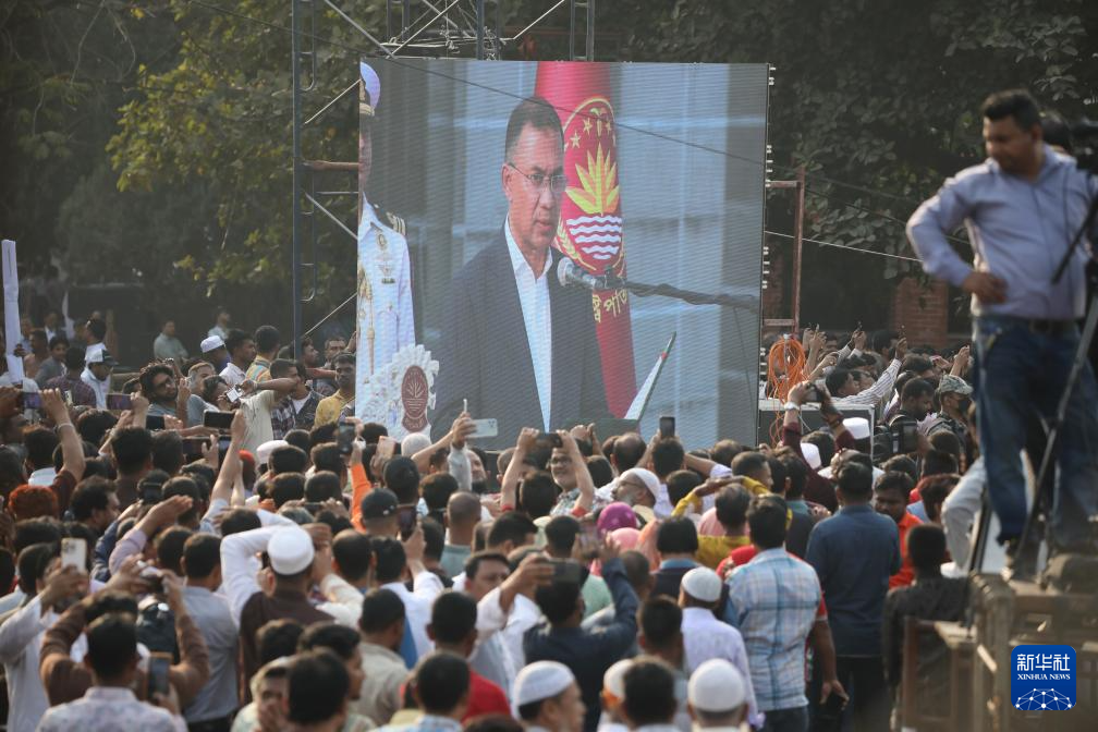 2月17日,在孟加拉国首都达卡,人们观看屏幕上塔里克·拉赫曼宣誓就任孟加拉国总理的画面。新华社发(哈比卜·拉赫曼摄)