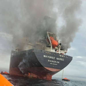 这张泰国海军3月11日发布的照片显示,一艘泰国货船在霍尔木兹海峡海域遭袭起火。新华社发(泰国海军供图)