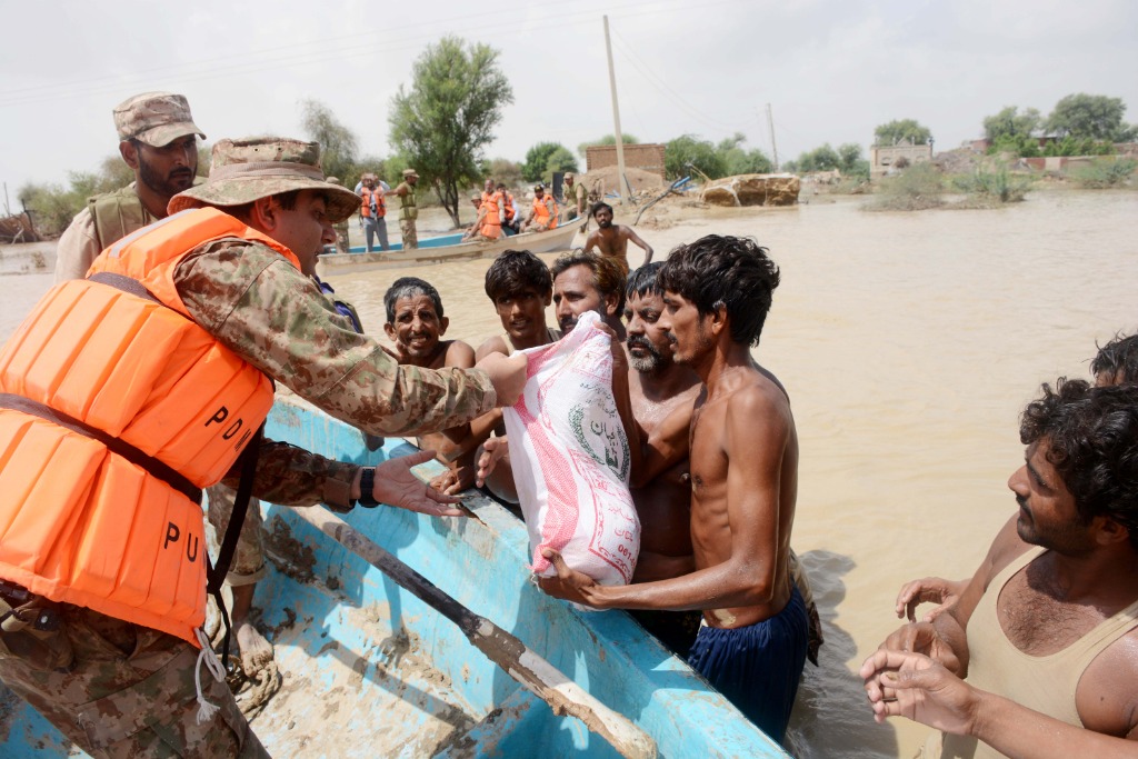 8月27日,在巴基斯坦拉金布尔,巴基斯坦军人向受灾民众发放物资。