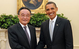 正在美国进行正式友好访问的中国全国人大常委会委员长吴邦国当地时间10日下午在白宫会见了美国总统奥巴马,宾主进行了亲切友好的交谈。