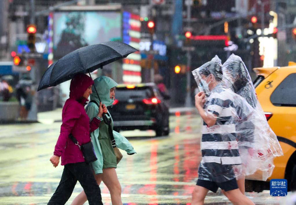 8月22日,人们行走在雨中的美国纽约时报广场上。受热带风暴“亨利”影响,美国纽约当日迎来降雨天气。新华社记者 王迎 摄