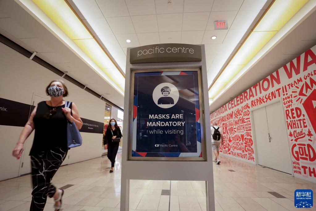 8月25日,在加拿大不列颠哥伦比亚省温哥华,人们从须戴口罩的告示旁走过。