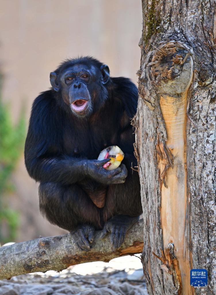 8月26日,一只黑猩猩在意大利罗马动物园享用冰冻食物。