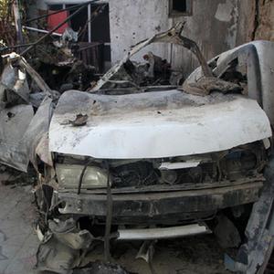 9月2日,在阿富汗喀布尔一处被美军空袭过的居民区,一名空袭遇难者的亲属站在汽车残骸旁。