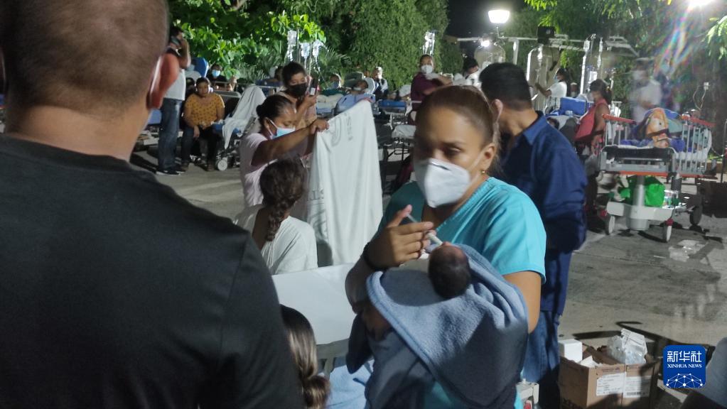9月8日,在墨西哥格雷罗州阿卡普尔科,一家医院的病患和医护人员在地震发生后转移到室外空地。