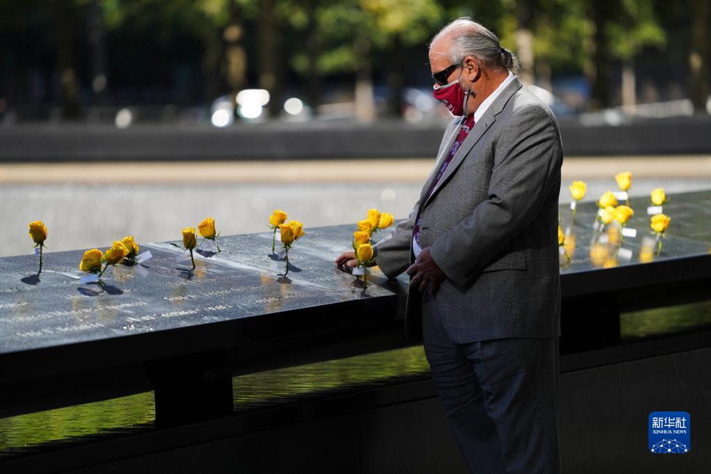 9月10日,一名男子在美国纽约的“9·11”纪念广场缅怀逝者。