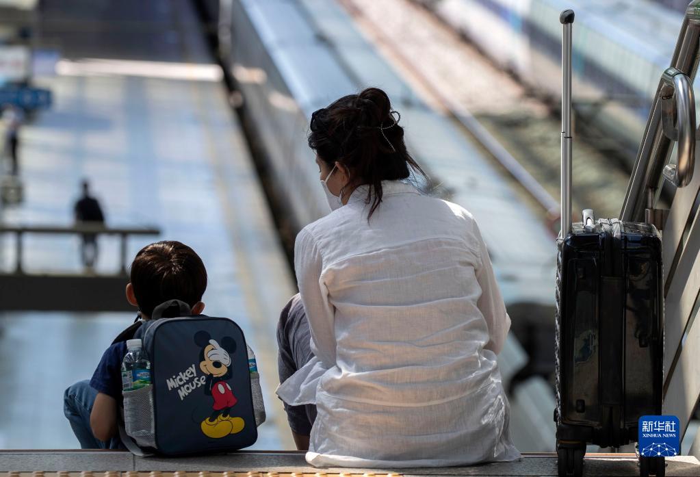 9月18日,在韩国首尔火车站,乘客坐在台阶上候车。
