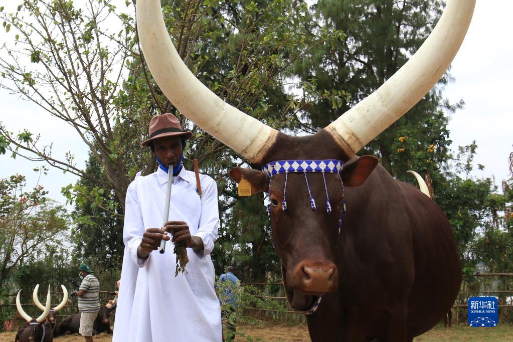9月17日,饲养员在卢旺达南方省首府为长角的安科勒牛吹奏乐曲。