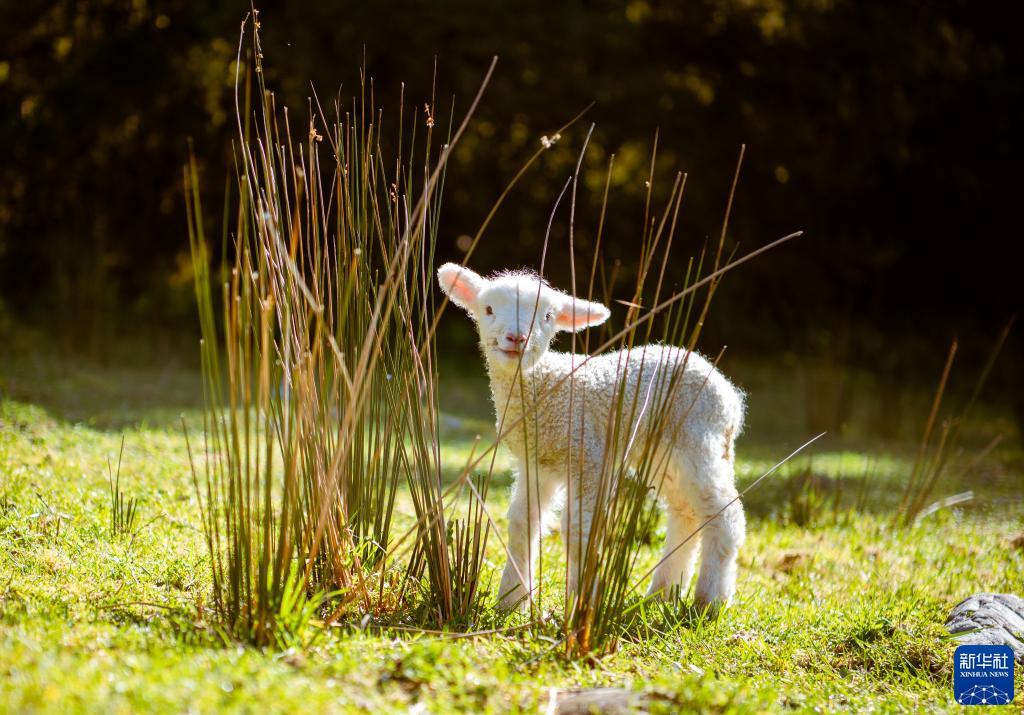 9月16日,在新西兰南岛西海岸福克斯冰川小镇春天的牧场,刚出生两天的羊羔走路还不太稳。