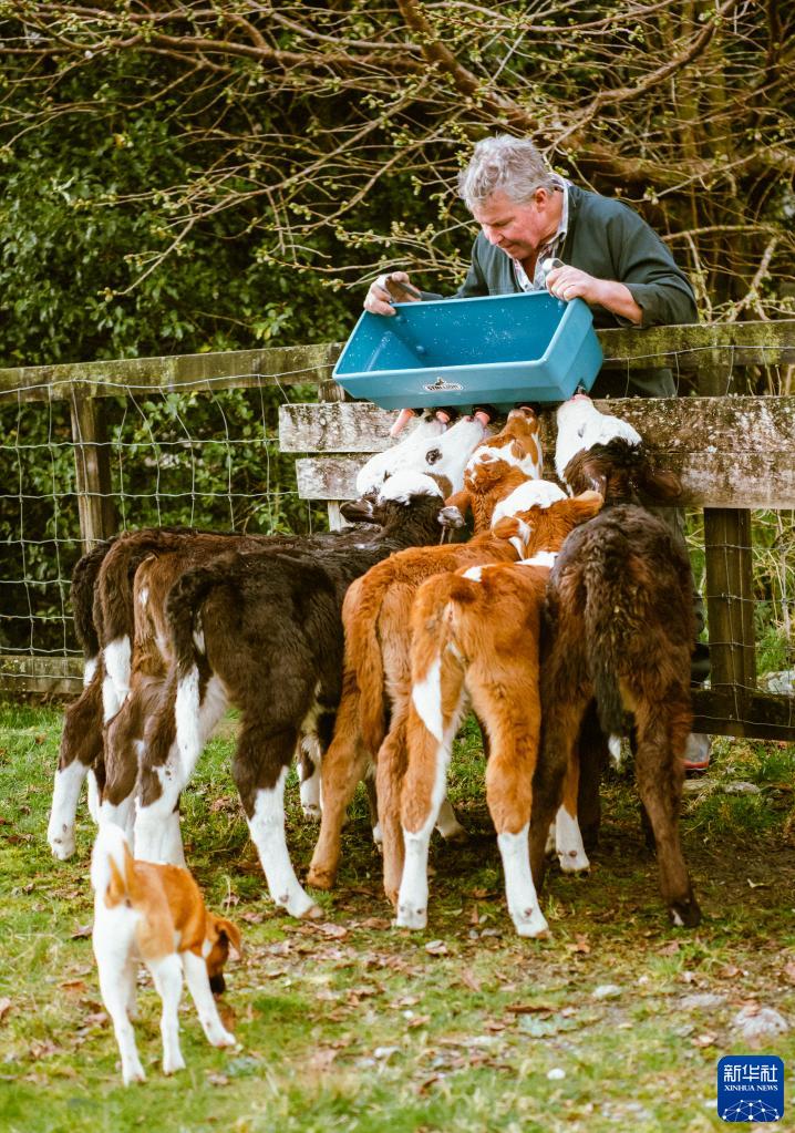 9月11日,在新西兰南岛西海岸福克斯冰川小镇春天的牧场,牧场主给初生的牛犊喂奶。
