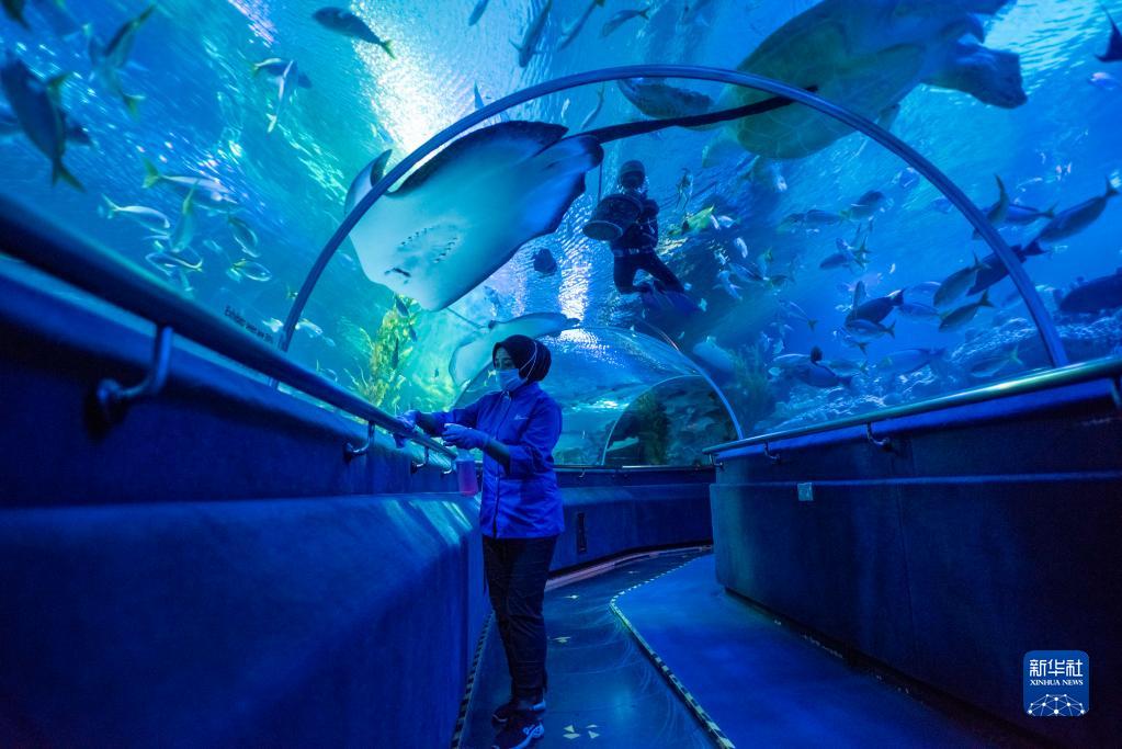 9月29日,一名工作人员在马来西亚吉隆坡城中城水族馆为重新开放做清洁。