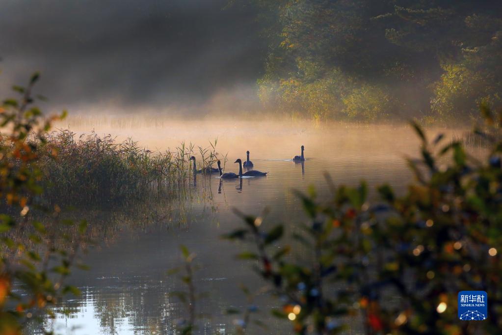 10月1日,水禽在白俄罗斯首都明斯克郊外的水面上游弋。