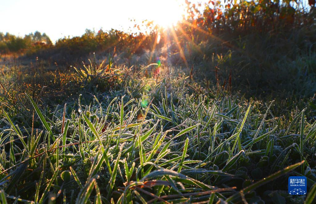这是在白俄罗斯首都明斯克郊外拍摄的结霜的草叶(10月1日摄)。